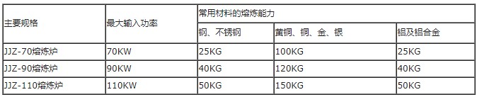 表中所列為每種熔煉爐的最大加熱能力,冷爐時,每爐熔煉時間為50--60分鐘,熱爐時,每爐熔煉時間為20--30分鐘。